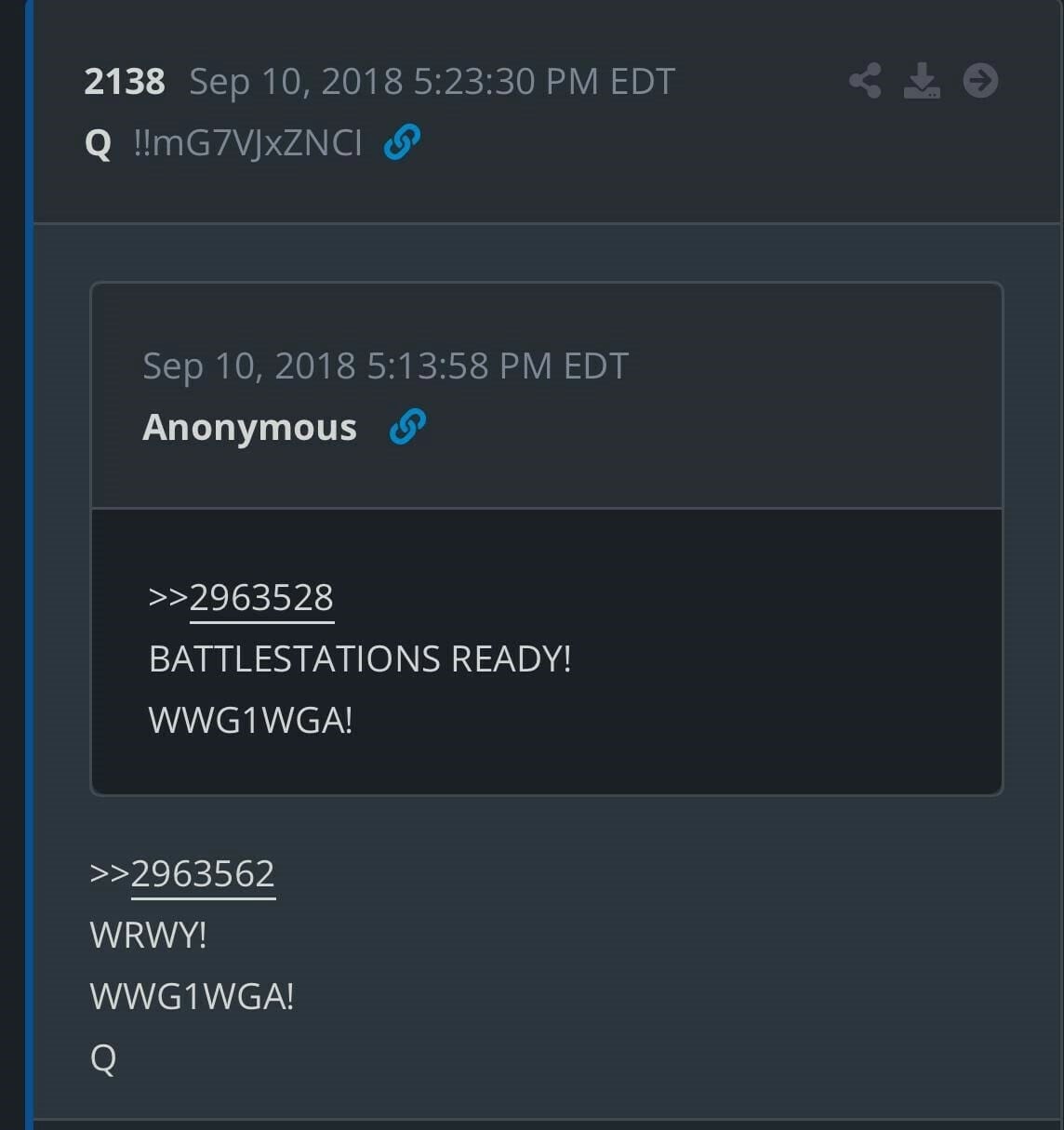 Furthermore, this just crossed my desk from another one of our very reliable field reporters. QUOTE: Hi James, I spied this before heading to bed... Trump posted on X... Trump’s first post since the election came at 9:38 or 21:38 military time. Take a look at [Q] drop #2138. END QUOTE [Here is the Q post!!!]