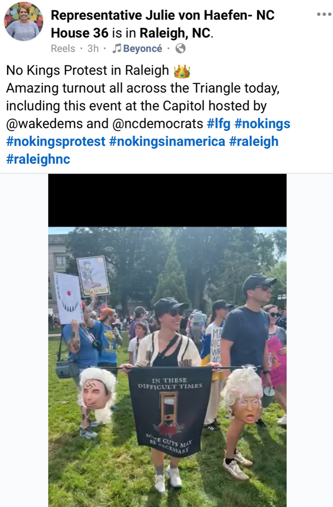 RALEIGH — The North Carolina Republican Party (NCGOP) is reiterating its call for Democratic State Rep. Julie von Haefen to resign following her shocking social media post indicating support for the assassination of President Donald Trump.