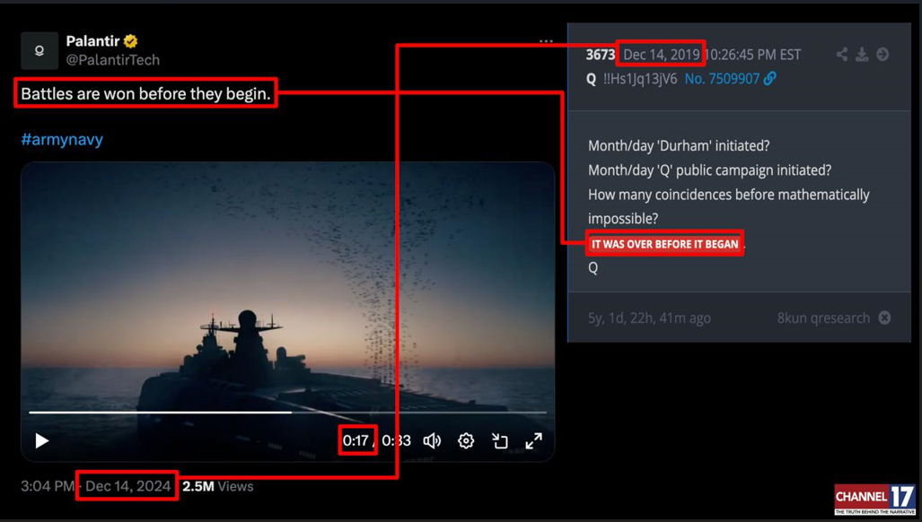 This advertisement which aired in the Army-Navy game on Saturday, December 14th, shows a swarm of drones being deployed at the :17 mark. The tag line is "Battles Are Won Before They Began." Curiously, it ran on the exact 5-year delta of Q Drop 3673 that says "It Was Over Before it Began"