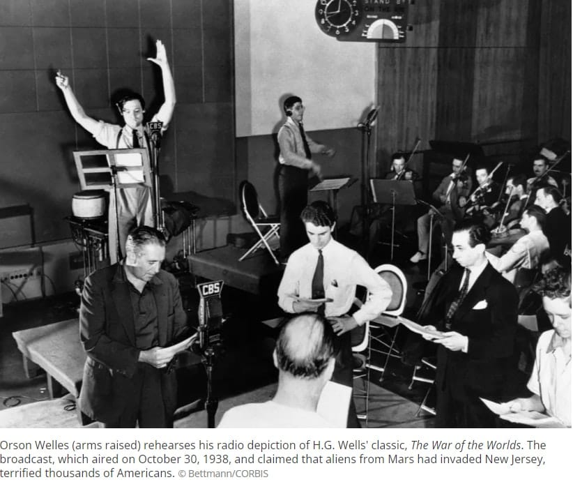 The point being, Orson Welles and his producers failed (on purpose?) to tell the radio audience that it was fiction. Welles simply came on the air and acted as though it were news of real events happening right then and there.
