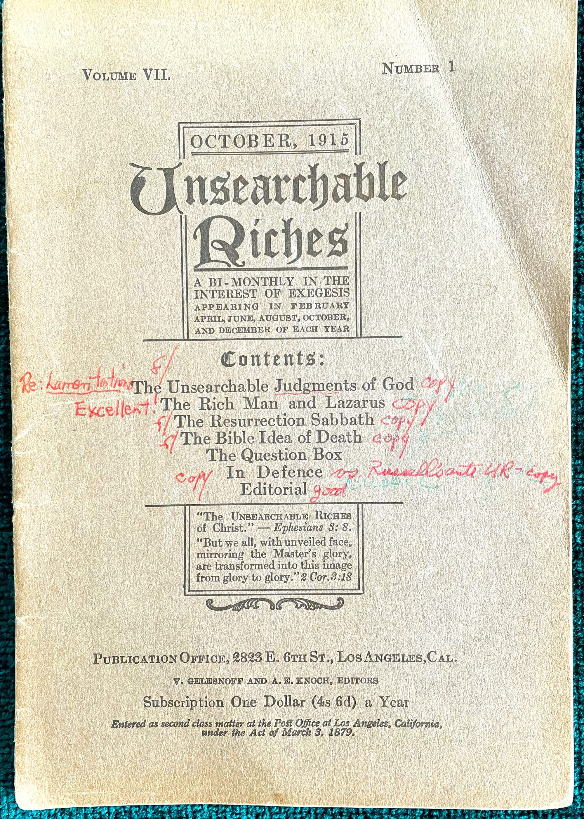 And yes, I have studied and understand the method which Mr. Knoch used to produce his Concordant version, but I cannot say that I have read everything I have in my possession from Concordant and/or Mr. Knoch because about 15-plus years ago, I inherited what I consider a true “treasure trove;” namely, hundreds of issues of the bi-monthly magazine, Unsearchable Riches, dating from the early 1900s to the late 1970s.