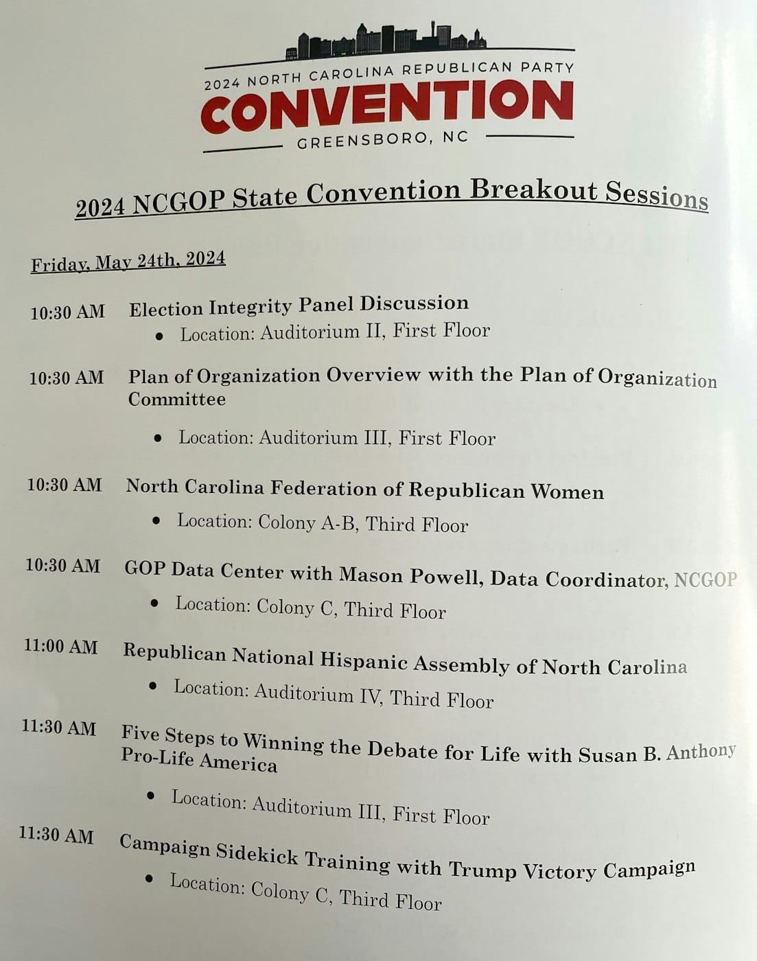 Friday’s (NCGOP) Business Sessions, though, were a must-attend in my estimation. I had to see “how the sausage is made.” In our state, though, I was not repelled, gagging, and refusing to ever eat “sausage” again, because I was quite well pleased with what I learned.
