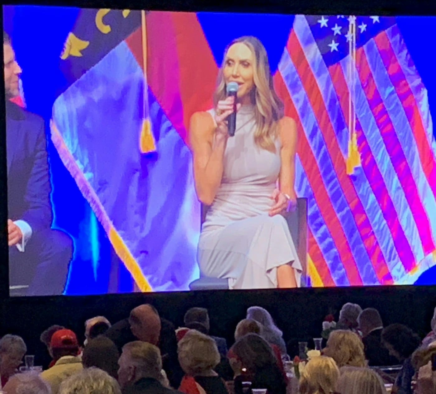 They each sat on a raised stool and simply had a conversation with NCGOP Chair, Jason Simmons…which was a nice change from a “red meat,” rah, rah, rah-type of speech. About five minutes into the “chat,” Eric looked at Lara and asked, “Hey, how about we see if we can get Dad on the phone and he can say a few words to the folks.” This was met with loud applause.