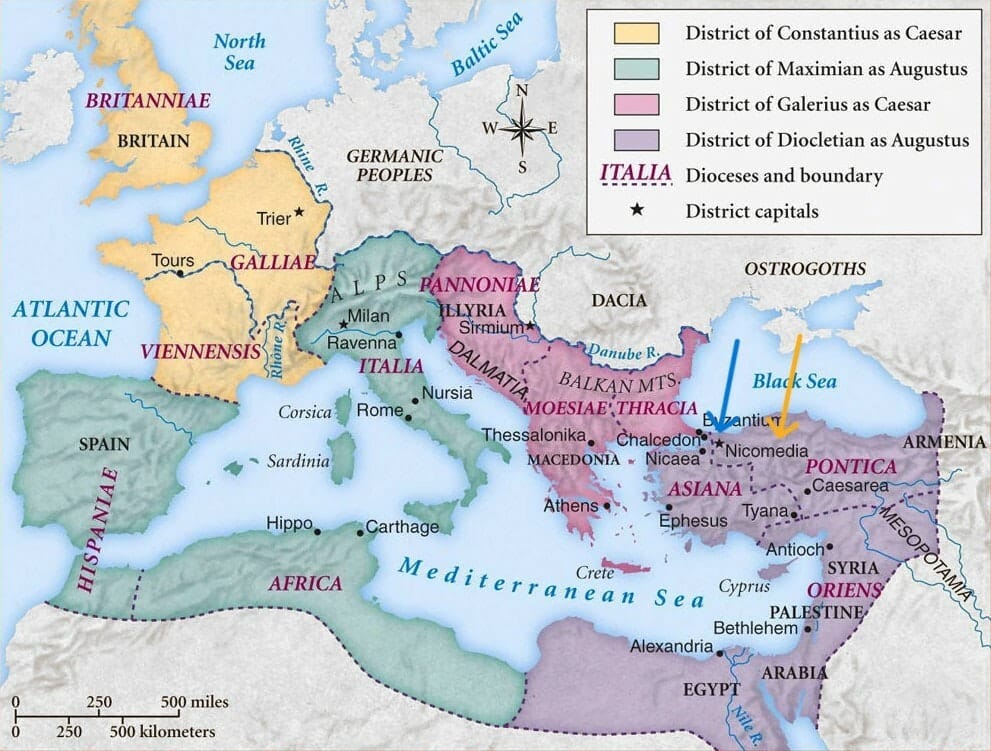 Nicomedia, by the way, is a city in northwest Asia Minor near the Bosporus Strait in present-day Turkey. Emperor Diocletian had chosen it for the capital of his Eastern Roman Empire, but it was soon superseded by Byzantium, i.e., Constantinople.