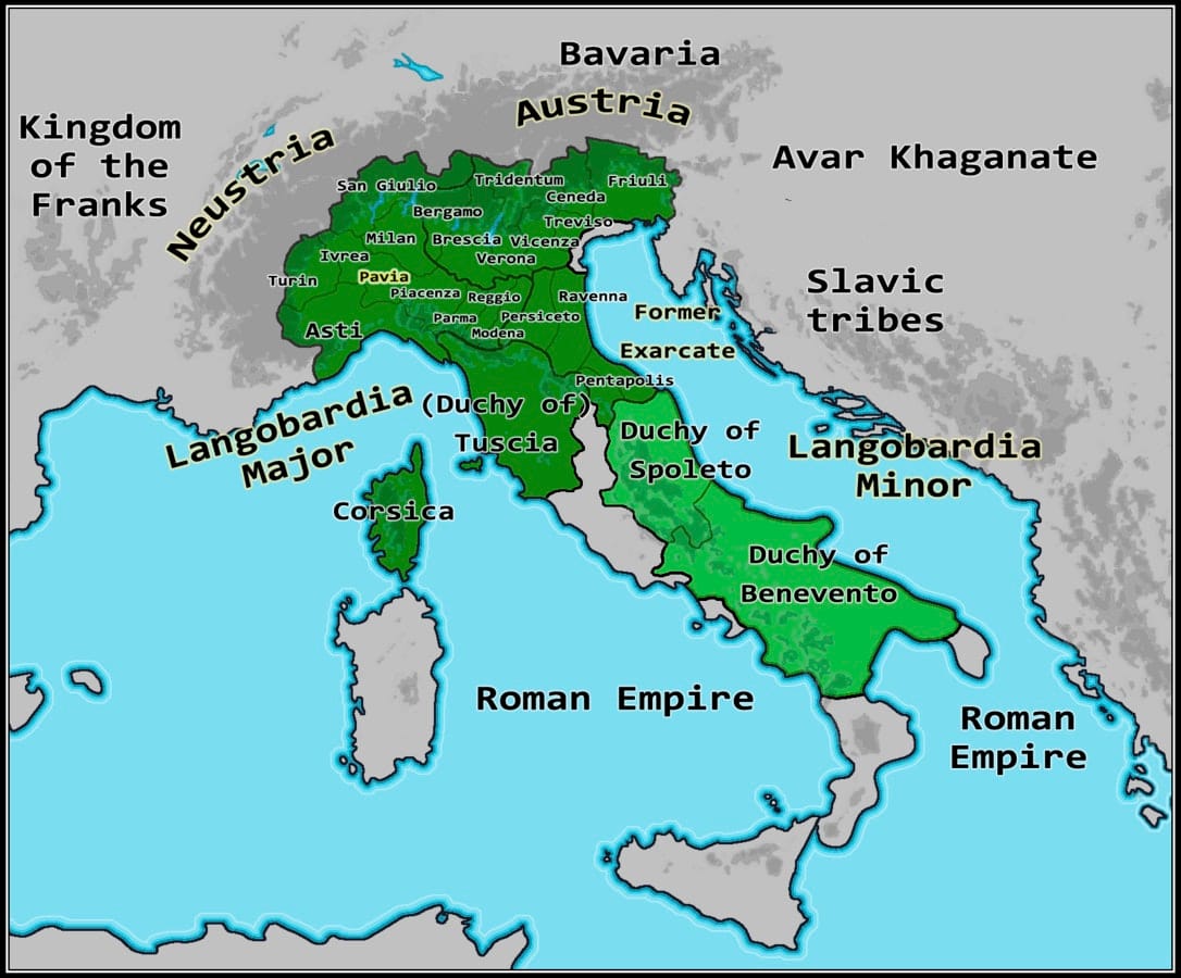 (The Kingdom of the Lombards at its greatest extent, ca. 751 A.D. The dark green is Langobardia Major and the lighter green in the south is the Langobardia Minor. Map from Wikimedia Commons)