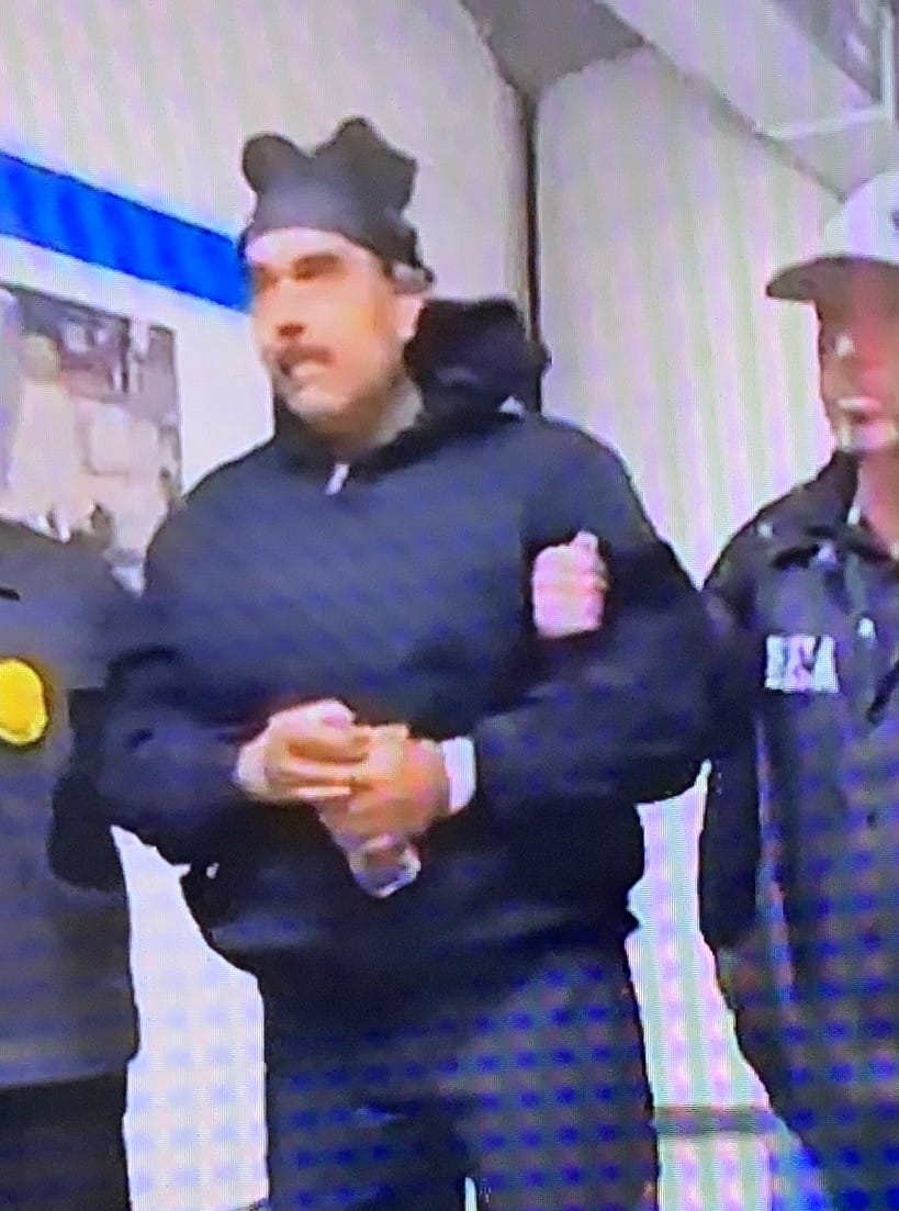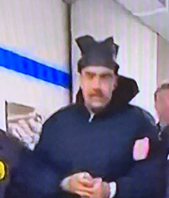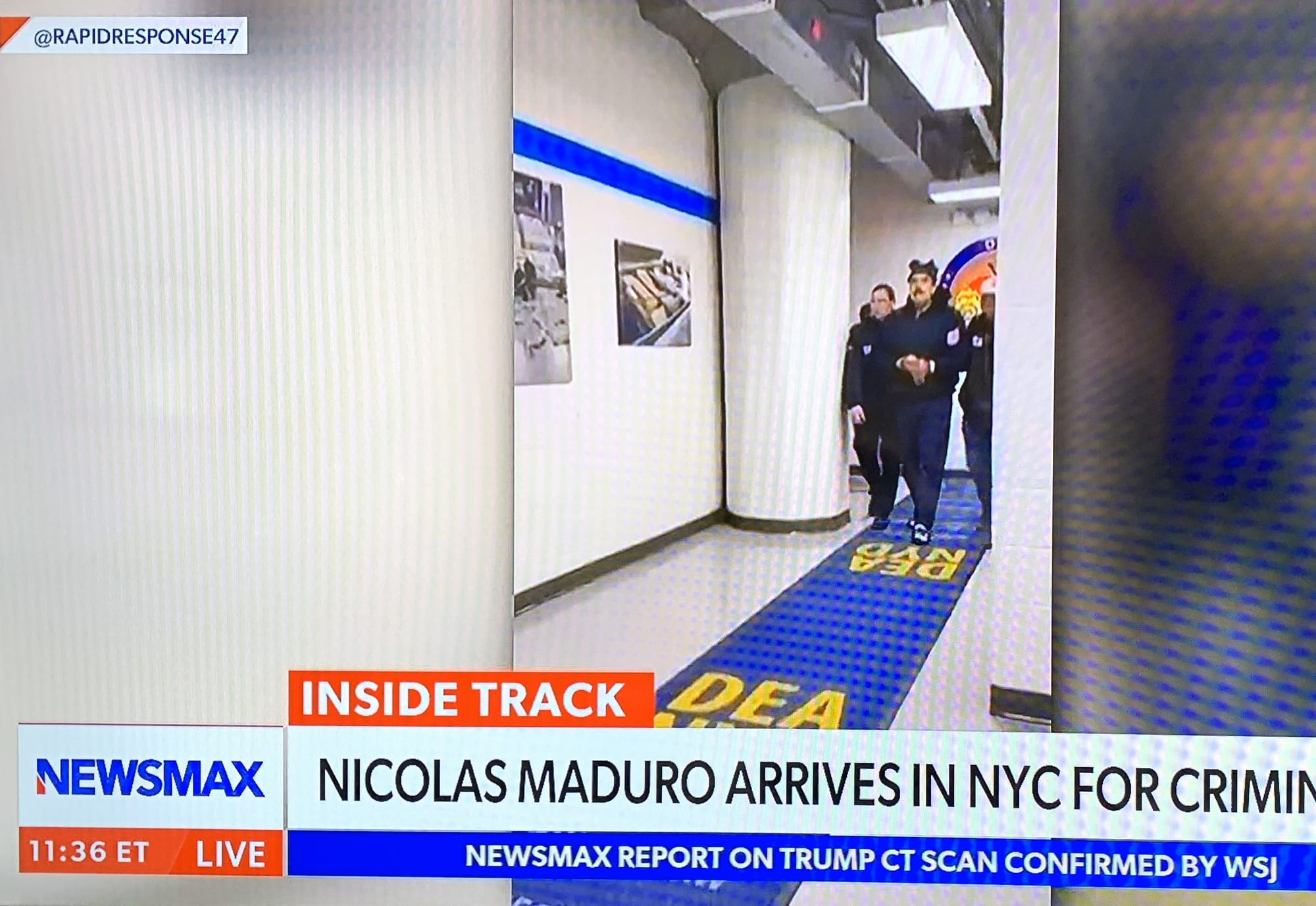 Next, if you saw when Maduro had arrived in New York and was being “perp-walked” in the hallway of the DEA-New York District facility, did you notice the weird hat/cap that he was wearing? Here are a couple of screen shots.