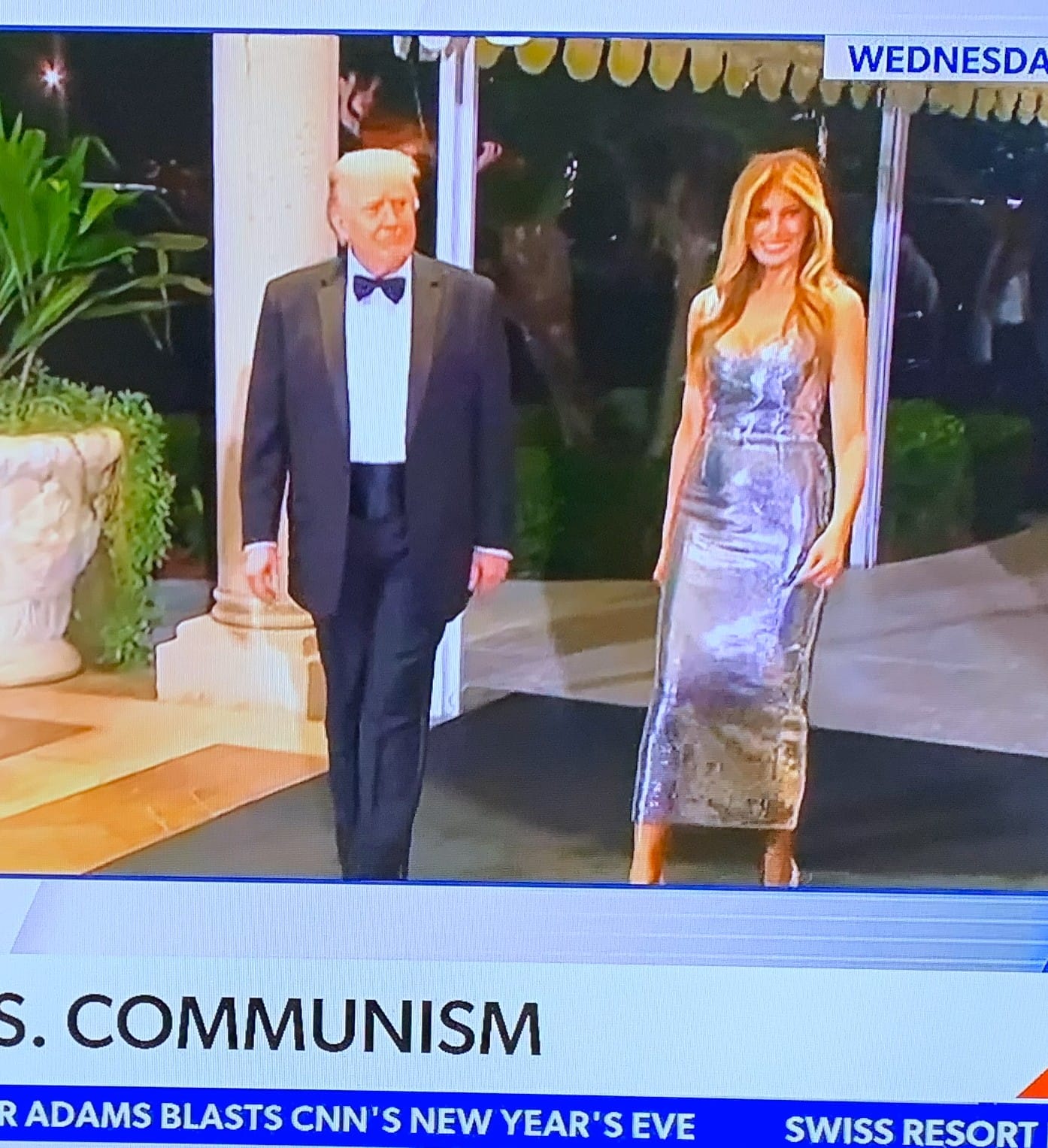 We have written extensively and in a number of blogs over the years about how Melania’s outfits were coded messages to those who learned how to interpret the comms. So, did you see the gown she was wearing on New Year’s Eve when she and her husband came out of a building at Mar-a-Lago? Here is a screen shot of that.