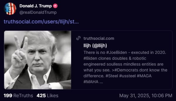 Without commenting on the merits of the bonkers conspiracy theory, Trump shared a post on Truth Social from llijh, a little-known user with fewer than 1,000 followers.