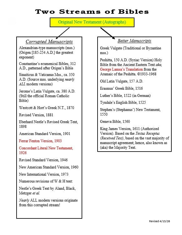 We had shown with the use of this chart (above) how our current English language Bible versions can be divided into just two basic streams of Bibles, those in the right-hand stream and those in the left-hand stream.